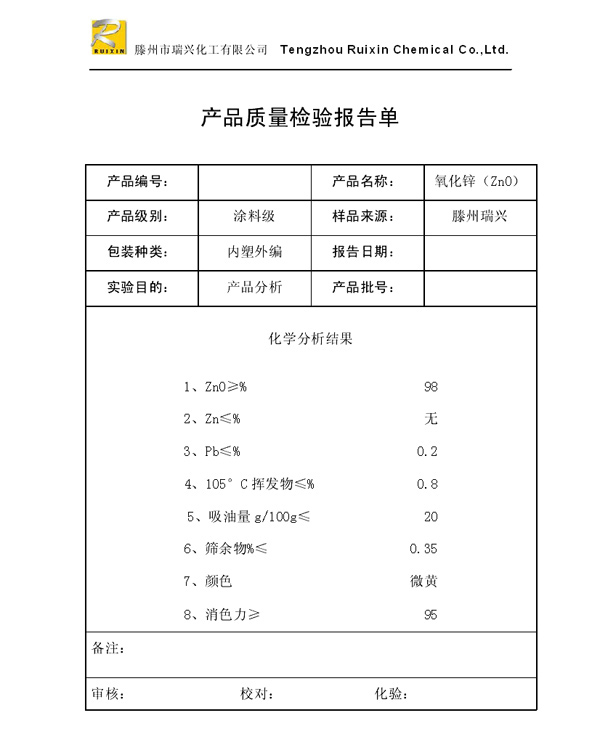 瑞興化工有限公司是生產(chǎn)氧化鋅的重點(diǎn)企業(yè),于2008年通過(guò)ISO9001:2008質(zhì)量管理體系認(rèn)證。“瑞興”牌氧化鋅在國(guó)內(nèi)擁有較大穩(wěn)定的市場(chǎng),并遠(yuǎn)銷東南亞、中東、中南美等國(guó)家和地區(qū),在國(guó)內(nèi)外享有較高聲譽(yù)。